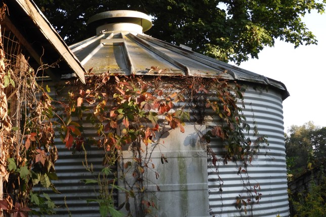 A wheat storage bin with autumn vines around the door.