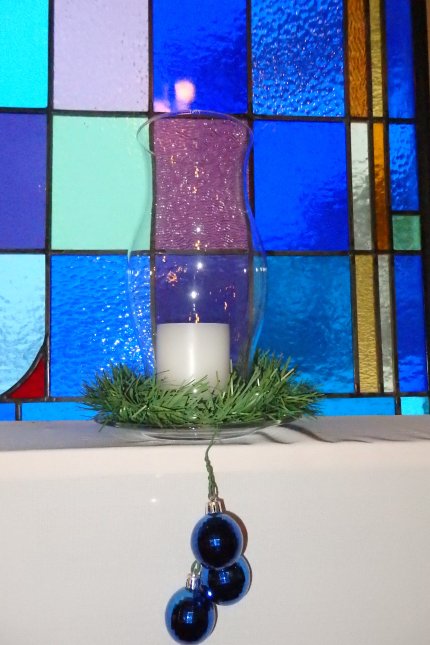 A candle in a hurricane lamp wtih three blue ornaments hanging from it and a stained class window behind the candle