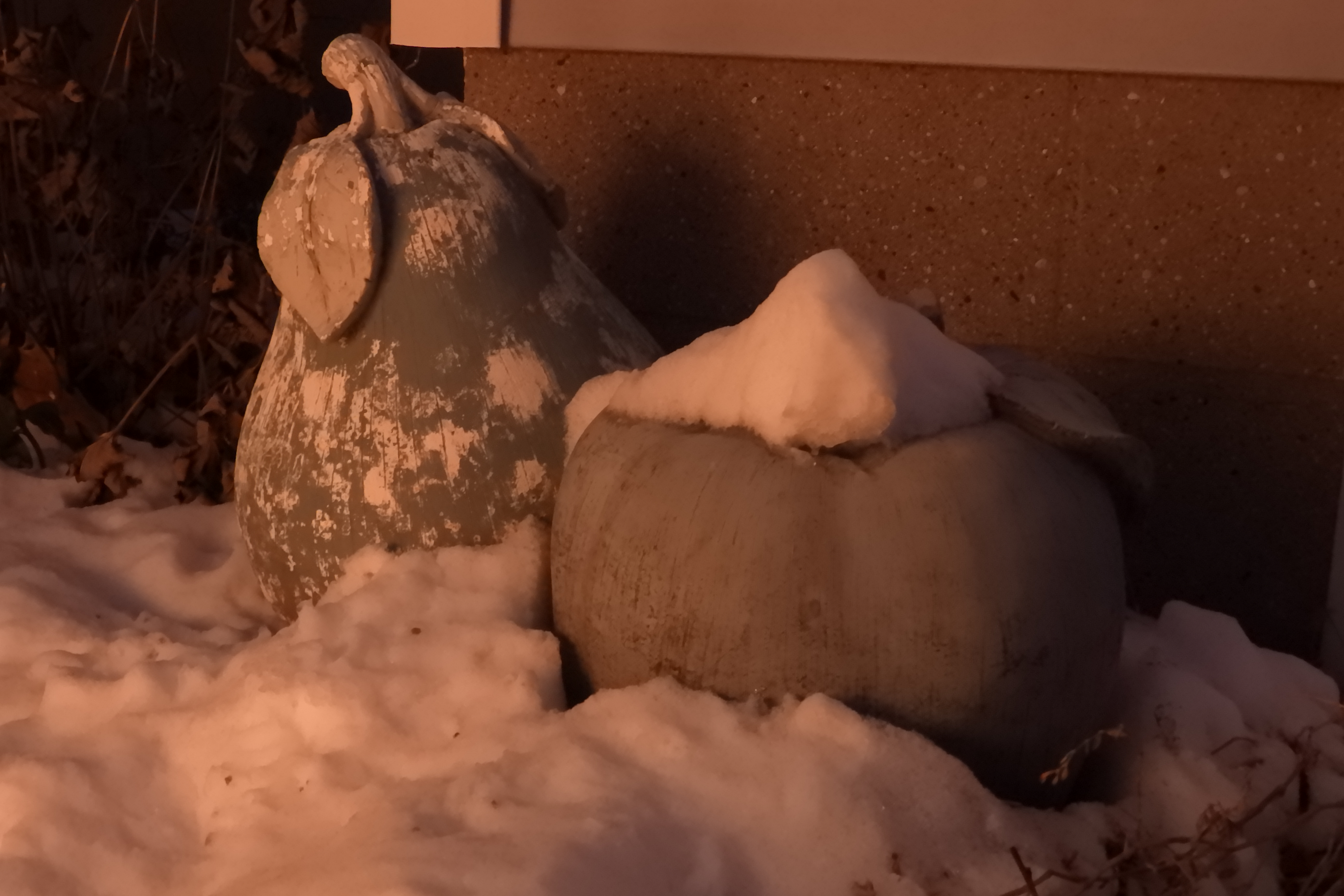 A large pear and a large apple, plastic, out in the snow.