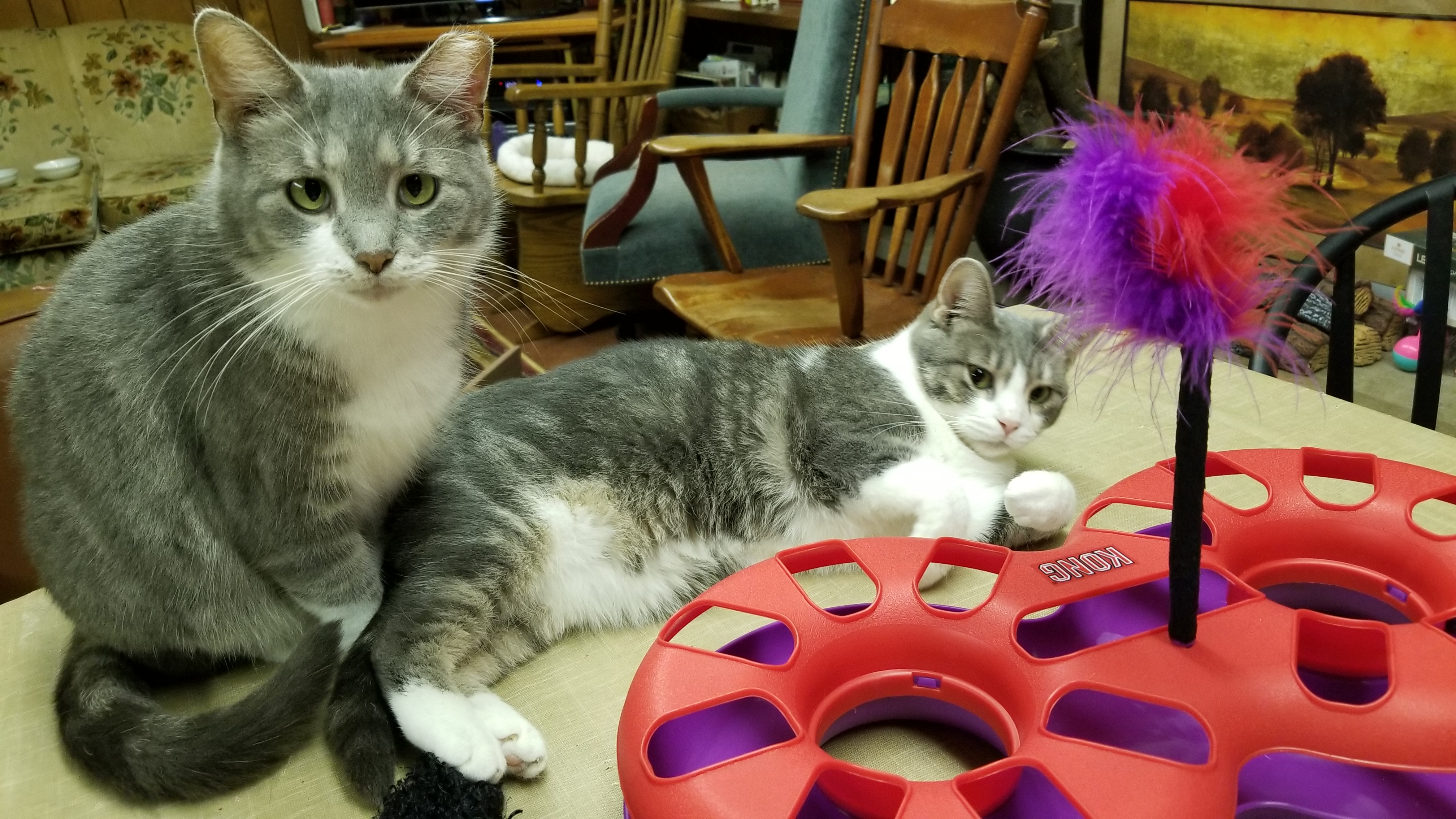 Willow is standing and Poppy is laying down playing with the red and purple toy that has a ball they chase around.