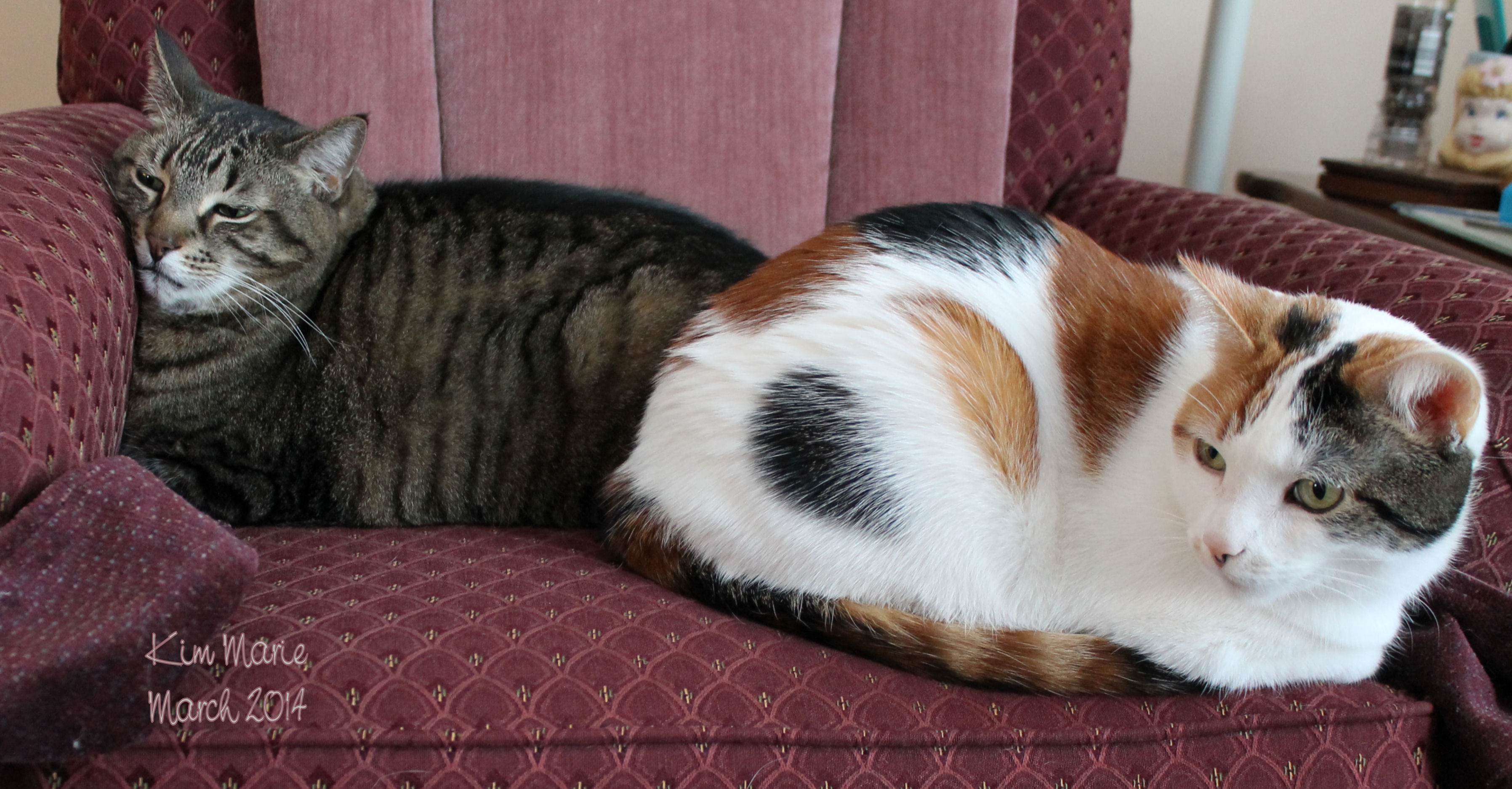 IMG_0436 SignA black tiger cat and a mostly white with some black and orange calico cat sit fanny to fanny on a maroon chair.