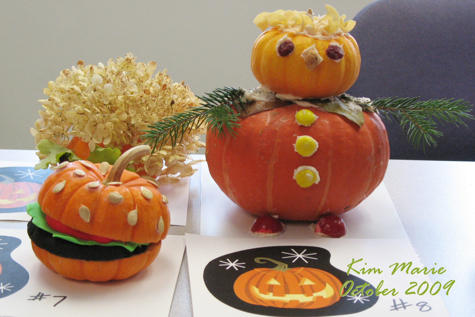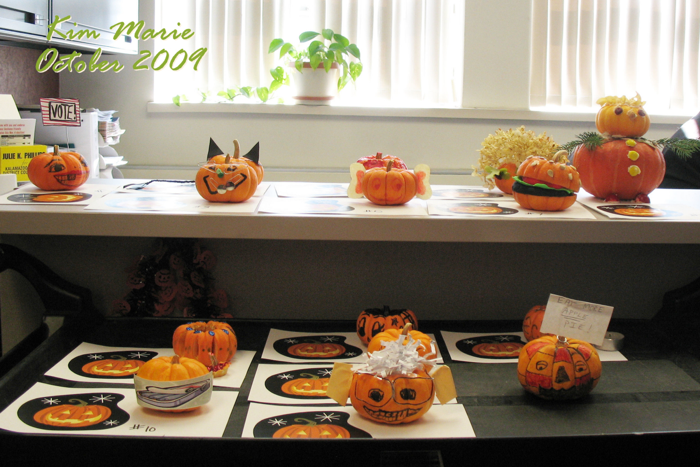 In the office I worked in back in 2008, we had mini-pumpkin decorating contests each Halloween. Thank goodness it wasn’t carving! I would not have done well, and I tend to do unintended damage with knives.