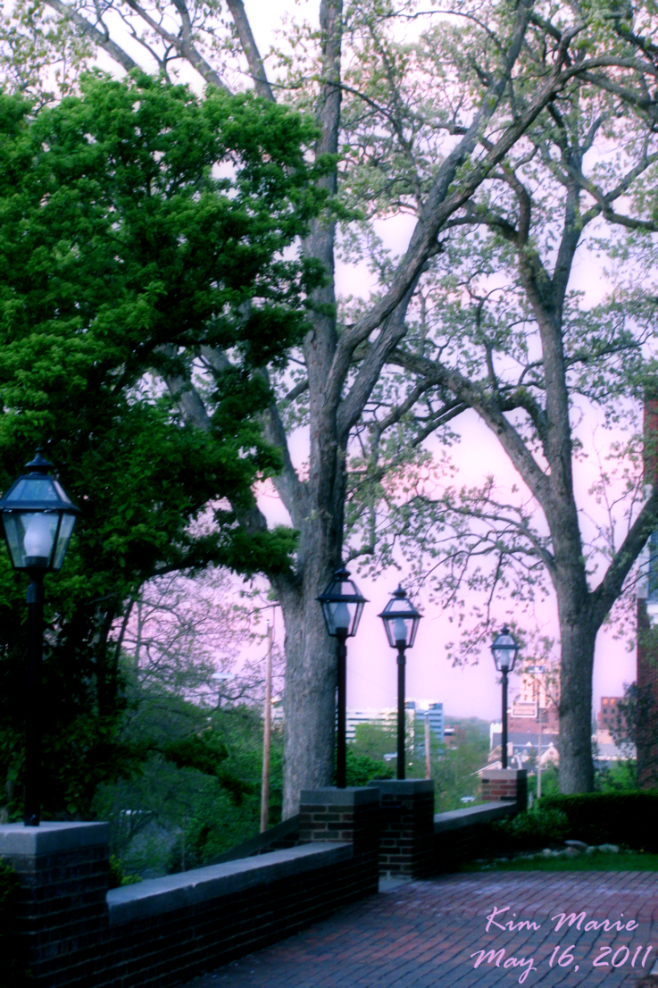 This is a photo taken on the campus of Kalamazoo Campus. It shows a little of the campus, and a little of the city of Kalamazoo.