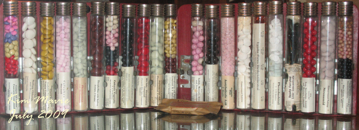 These are medications from yester year with Upjohn pharmaceuticals. Some names are Sodium Chloride, Cathartic Vegetable, Phenobarbital, Acetylsalicylic Acid, Ferrated Liver Concentrate, and, lastly, Iron, Strychnine, Arsenic, and Mercury compound.